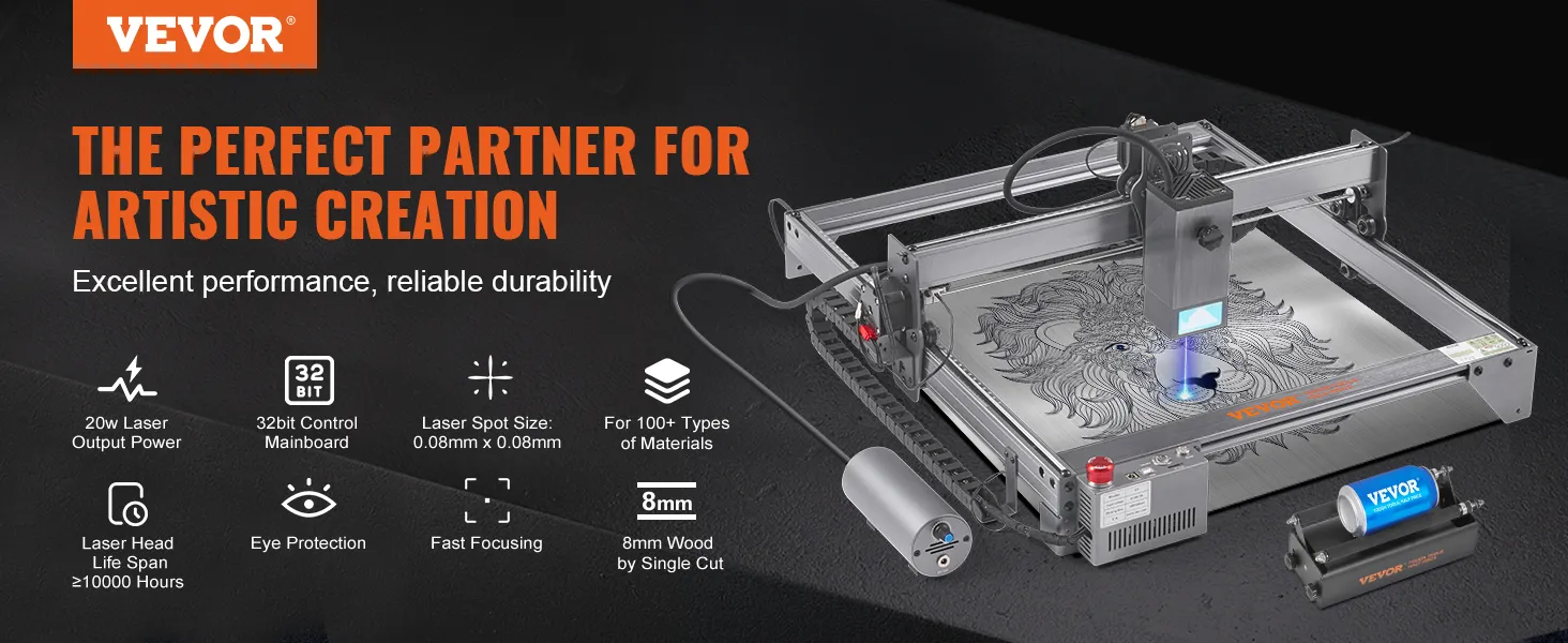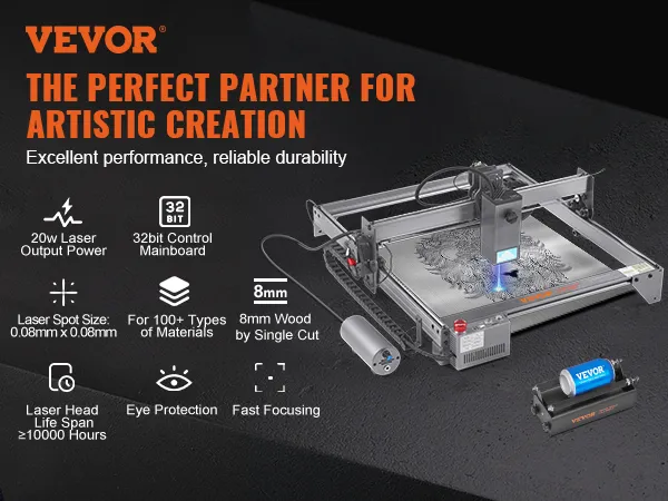 Uitstekende prestaties, betrouwbare kwaliteit: ervaar uitzonderlijke prestaties met onze lasergraveerder. Met een laservermogen van 20 W graveert en snijdt hij moeiteloos meer dan 100 soorten materiaal. Geniet van ultramoderne functies zoals een maximale houtsnijcapaciteit van 5 mm, een levensduur van de laserkop van meer dan 10.000 uur (bij 80% vermogen) en een ruim graveergebied van 400 x 400 mm. Ideaal voor commerciële en persoonlijke doe-het-zelfprojecten.