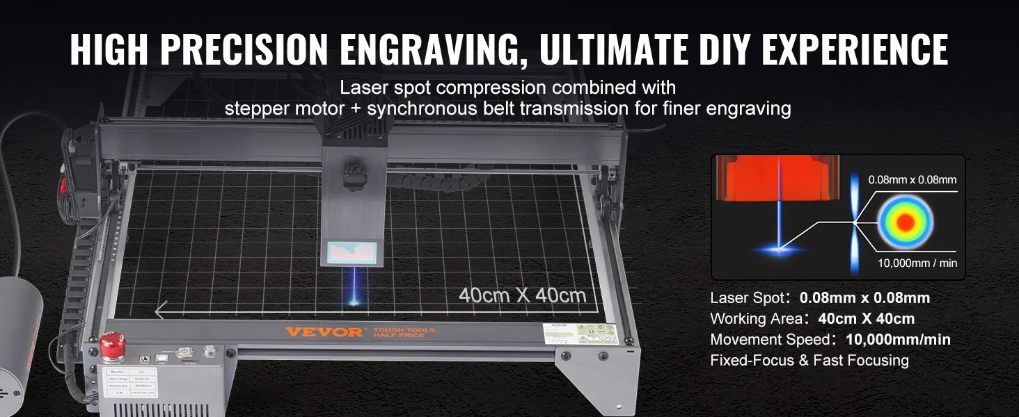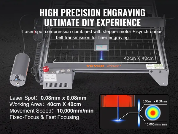 PRECISIE & VAKMANSCHAP COMBINEREN: Onze lasergraveermachine is voorzien van innovatieve lasertechnologie en spotcompressie die snellere, nauwkeurigere resultaten levert voor al uw graveerbehoeften. De laserstraalgrootte van 0,08 x 0,08 mm zorgt voor geconcentreerde energie en fijner, gemakkelijker graveren en snijden. De stappenmotor en tandriemaandrijving maken een hoge snelheidsgravering mogelijk tot 10.000 mm/min met een overdrachtsnauwkeurigheid van 0,2 mm/m. Geniet van de ultieme graveerervaring.