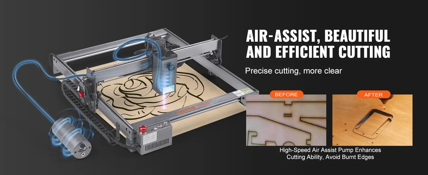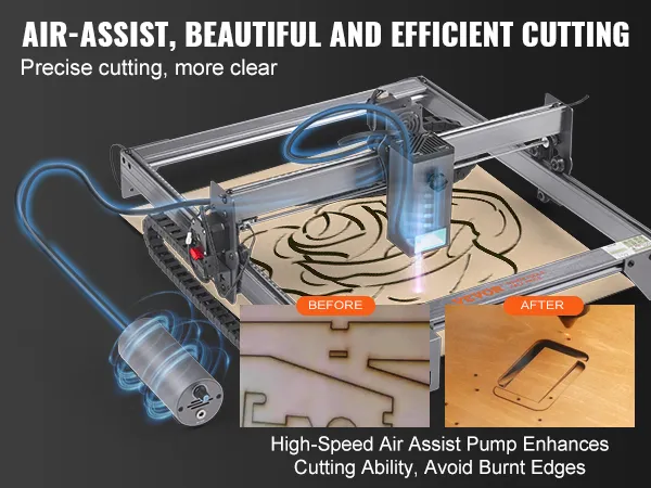 Verbeterd luchtondersteund snijden: onze lasersnijder gebruikt een luchtstroom met hoge snelheid om de snijeigenschappen te verbeteren, donkere snijranden te elimineren en een schone en gladde afwerking te bereiken. Het verlaagt op efficiënte wijze de oppervlaktetemperatuur van objecten tijdens het graveren en snijden, wat resulteert in schone en scherpe randen. Ervaar de schoonheid van precisiesnijden met verbeterde prestaties en tijdbesparende efficiëntie.