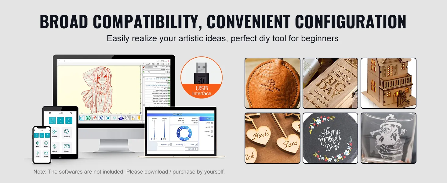 Gebruiksvriendelijk en compatibel: onze lasergraveermachine voor hout heeft een uitstekende softwarecompatibiliteit en wordt via USB op uw computer aangesloten. Het is compatibel met populaire lasergraveersoftware zoals LightBurn en LaserGRBL (ondersteunt iOS-, Windows- of Linux-systemen). Graveer verschillende materialen, waaronder hout, acryl, papier, leer, stof, roestvrij staal en glas. Breng moeiteloos uw artistieke ideeën tot leven.