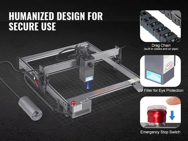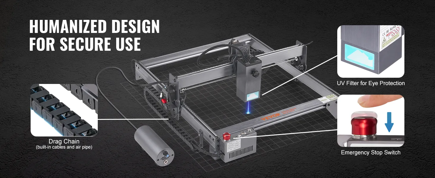 De noodstopknop maakt een snelle reactie in onverwachte situaties mogelijk. Het UV-filter beschermt je ogen tegen 97% van het schadelijke ultraviolette licht. Onze graveermachine voldoet aan de CE- en FCC-veiligheidsregels en heeft FDA- en IEC 60825-certificering voor laserproducten.