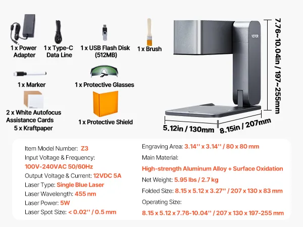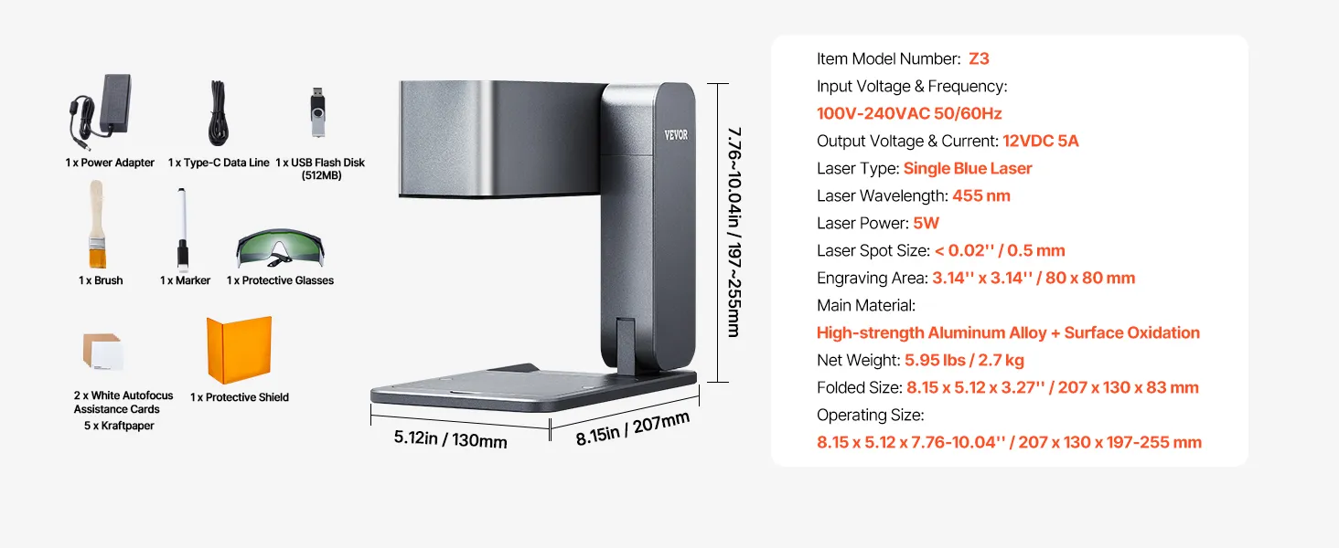 Deze 5W blauwe lasergraveerder biedt een snelheid van 600 mm/s en een graveeroppervlak van 80 x 80 mm. Met one-touch autofocus en een laserpunt van 0,02 inch is hij ideaal voor het graveren van niet-metalen materialen.
