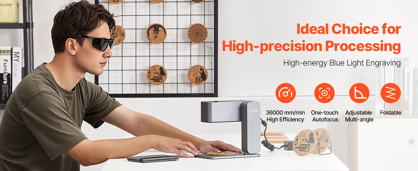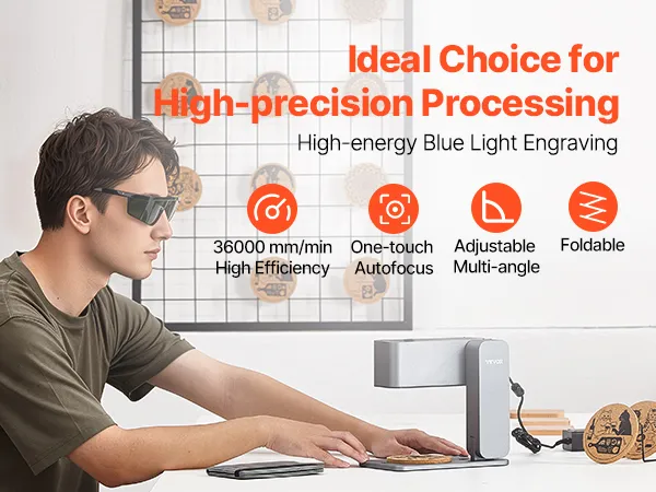 Autofocus met één klik: deze draagbare lasergraveerder heeft een laserspot kleiner dan 0,5 mm (0,02 inch) met een golflengte van 455 nm en een levensduur van maximaal 10.000 uur. Het maakt snel en uiterst nauwkeurig graveren en snijden mogelijk op een verscheidenheid aan niet-metalen materialen, waaronder karton, hout, stof, leer, steen en keramiek - ideaal voor zowel gedetailleerd werk als grote projecten.