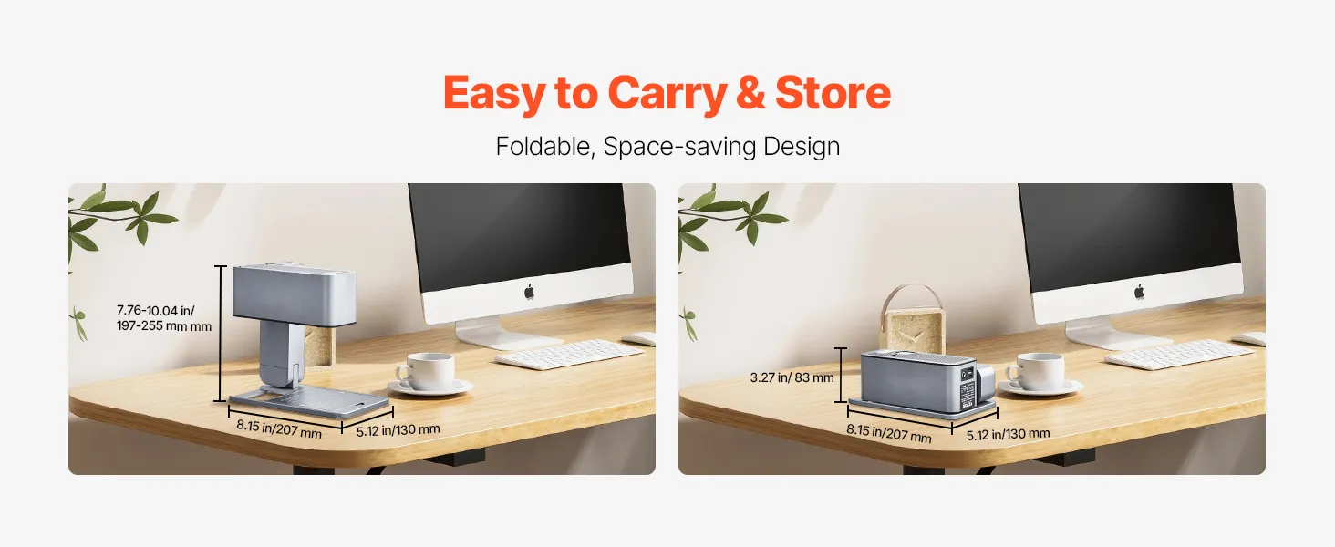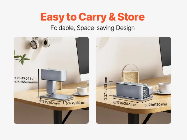 Compact opvouwbaar ontwerp: deze fiberlasergraveerder is ontworpen voor ultieme draagbaarheid en eenvoudige opslag. Hij kan worden opgevouwen tot een compact formaat van 207 x 130 x 83 mm (8,15 x 5,12 x 3,27 inch), waardoor hij minimale ruimte in beslag neemt en gemakkelijk kan worden opgeborgen en vervoerd, zodat u onderweg kunt graveren.
