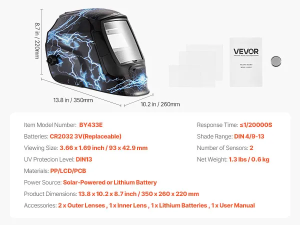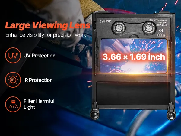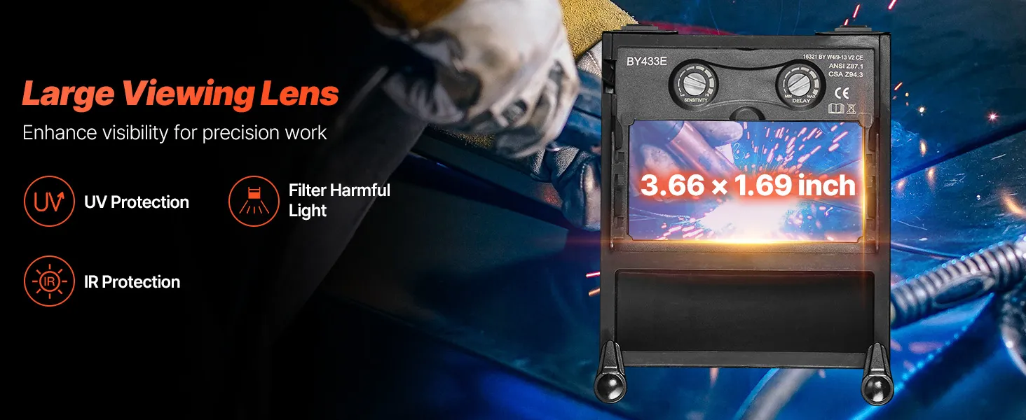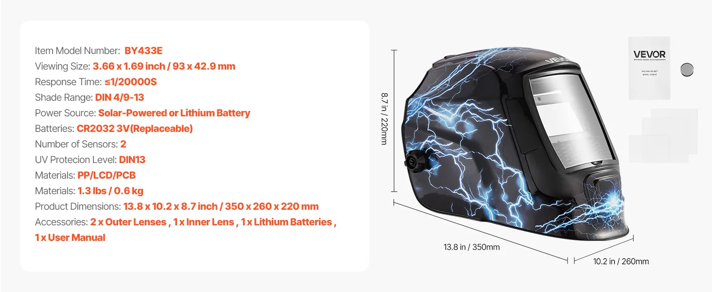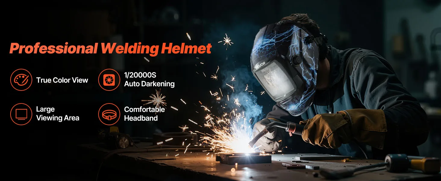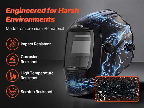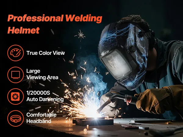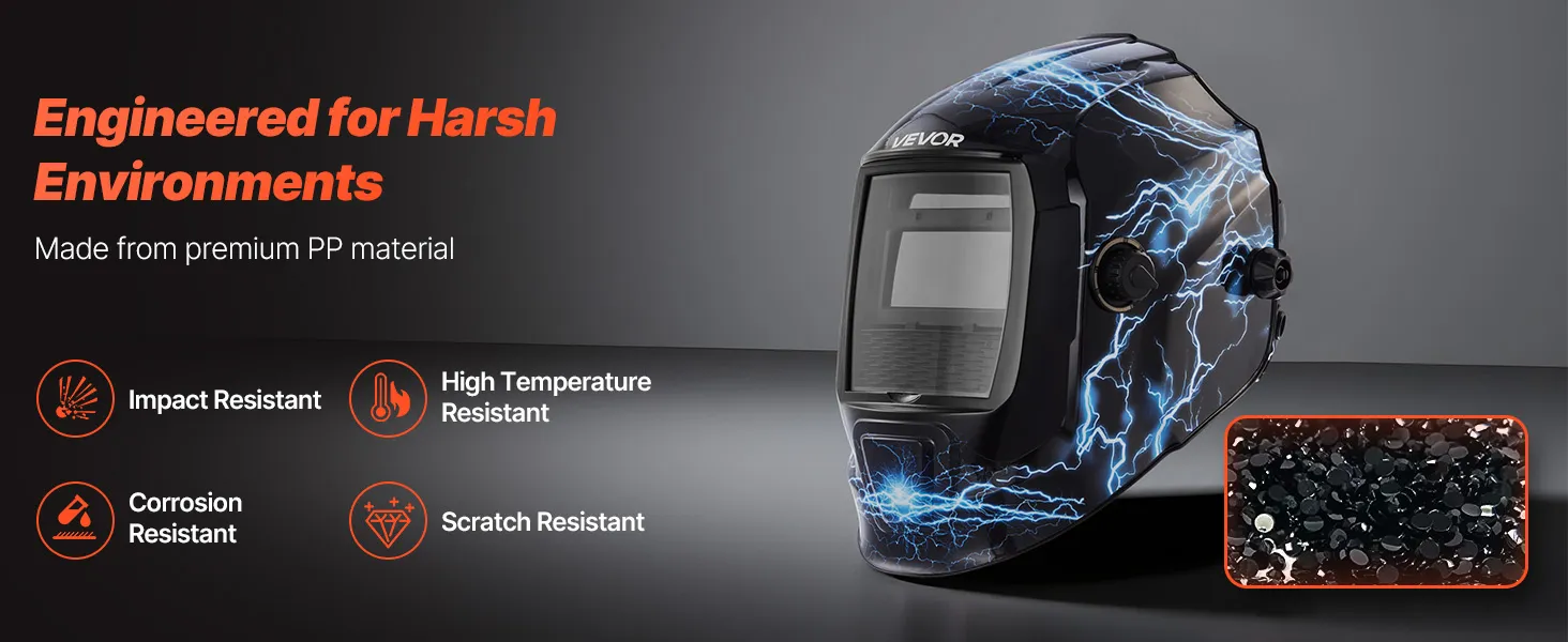 De automatisch verduisterende lashelm van VEVOR beschikt over een breed tintbereik van DIN 4/9-13, True Color-technologie en dubbele boogsensoren, wat zorgt voor een helderdere en natuurlijkere kijkervaring. De helm filtert effectief schadelijk licht, vermindert vermoeidheid van de ogen en zorgt voor veiliger slijp- en laswerk.