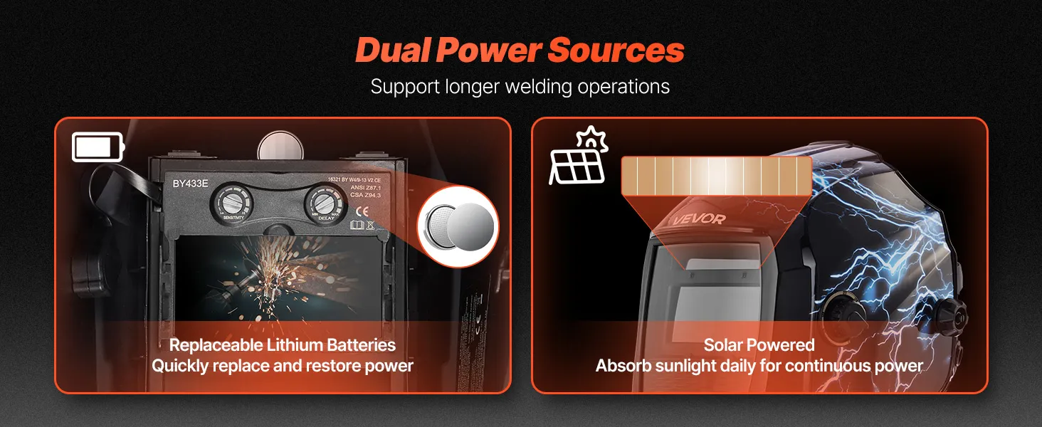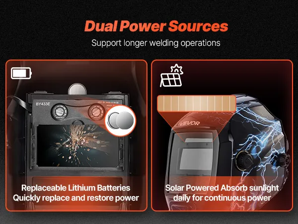 Op zonne-energie: Deze automatisch verduisterende lashelm is voorzien van een lithiumbatterij en ondersteunt opladen via zonne-energie, waardoor het niet nodig is om de batterij regelmatig te vervangen. De stabiele stroomvoorziening zorgt voor consistente, langdurige prestaties.