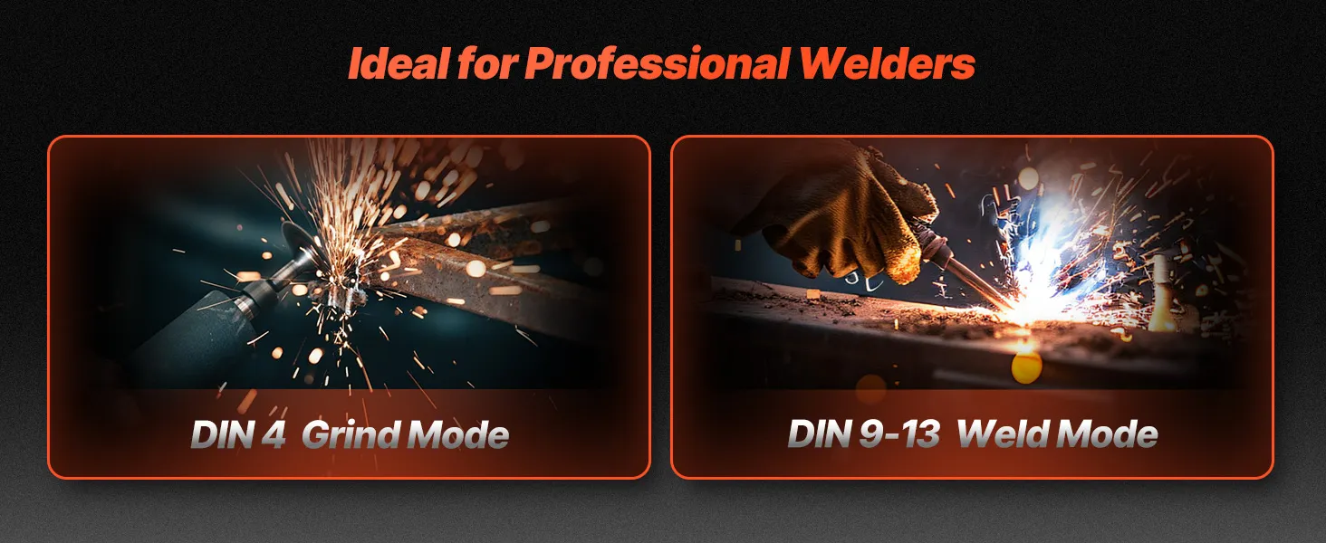 Verstelbare bescherming: Ons kleurechte lasmasker beschikt over instelbare DIN-beschermingsniveaus – DIN 4 (slijpmodus) en DIN 9-13 (lasmodus). Schakel eenvoudig tussen werkmodi voor meer efficiëntie en veiligheid tijdens het lassen en slijpen.