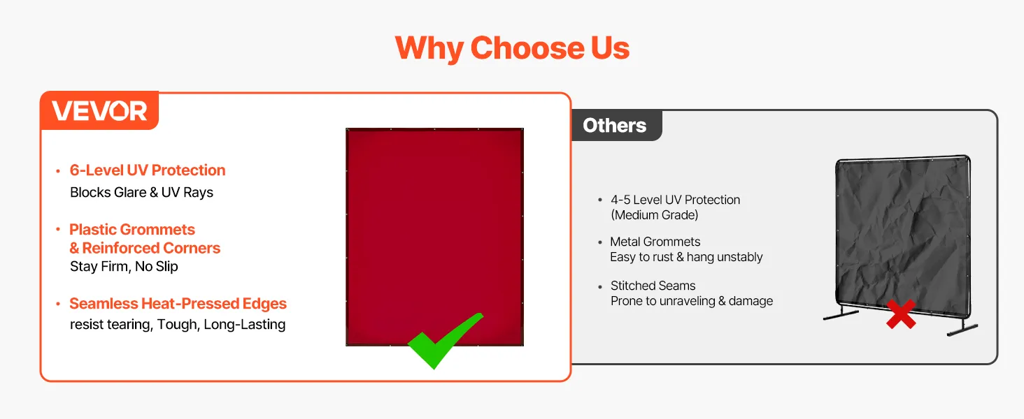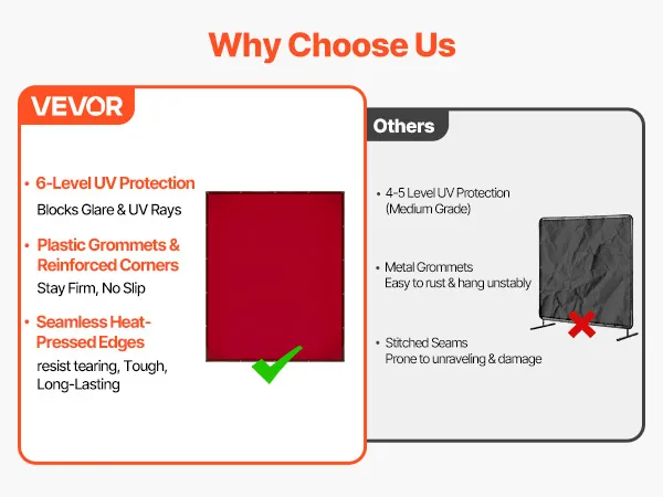 Ons vlamvertragende vinyl lasgordijn beschikt over 6 niveaus van UV-bescherming, waardoor de straling wordt verminderd en uw zicht en huid worden beschermd.
