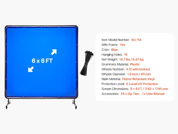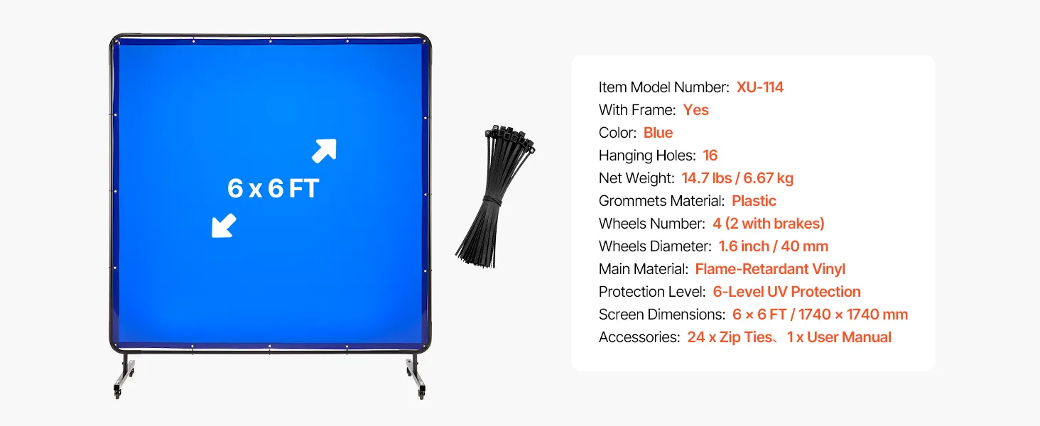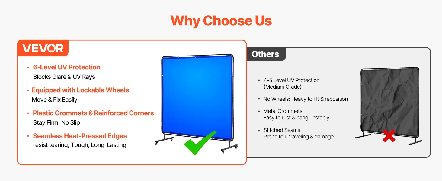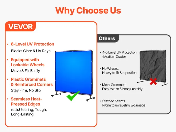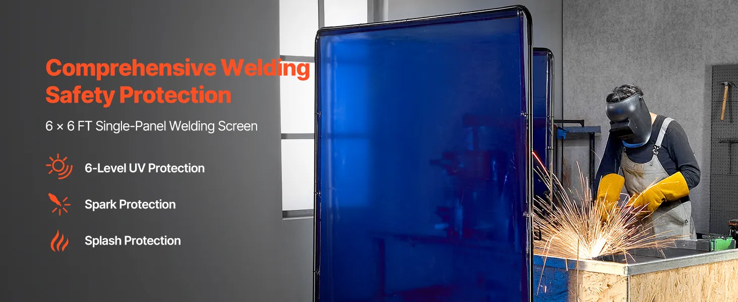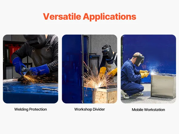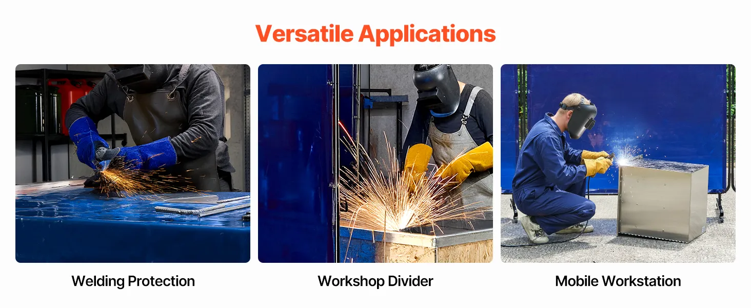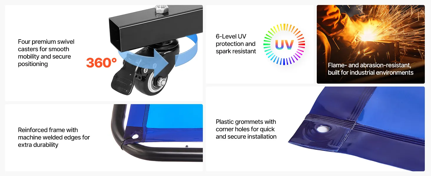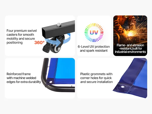 Laat hoge temperaturen, vonken, gesmolten metaal of spetters uw werk niet verstoren. Het VEVOR lasgordijn met frame biedt uitgebreide en betrouwbare bescherming in laswerkplaatsen, scheepswerven, industriële installaties en meer.