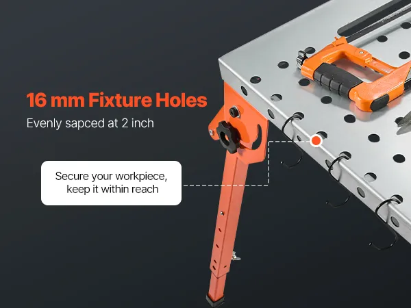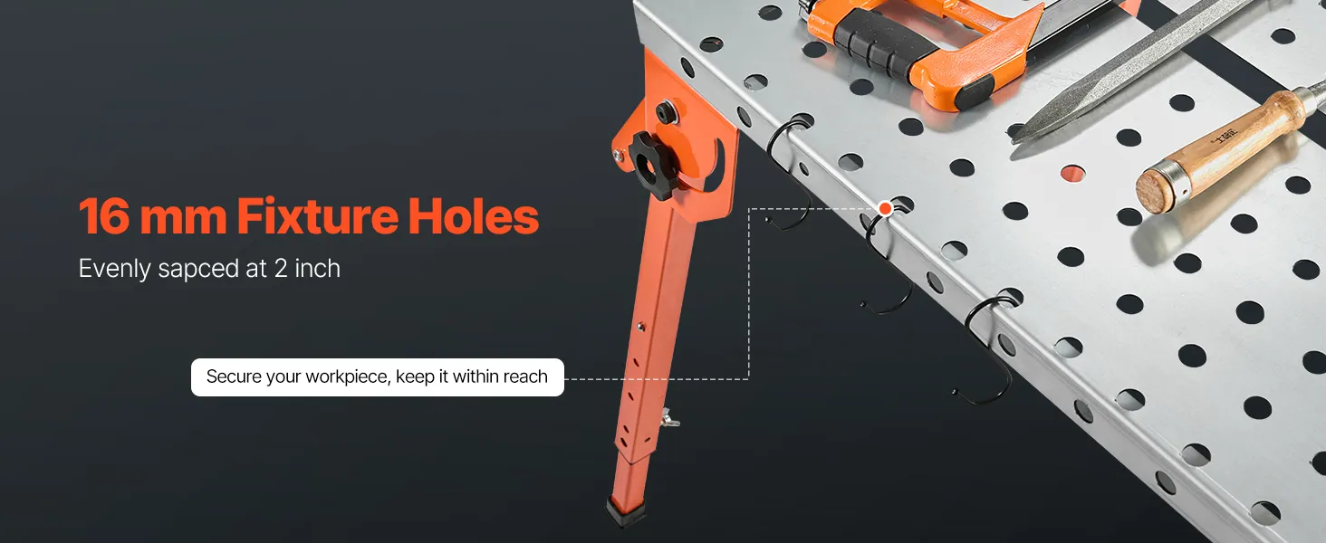 Eenvoudig lassen: Dankzij de meerdere bevestigingsgaten van 0,63 inch / 16 mm (met een tussenruimte van 2 inch / 50,8 mm) en 6 gereedschapssleuven kunt u uw bevestigingen eenvoudig op deze laswerkbank klemmen. Zo houdt u uw gereedschap binnen handbereik en uw werkplek georganiseerd. Zeg vaarwel tegen rommel en geniet van een efficiëntere werkomgeving.