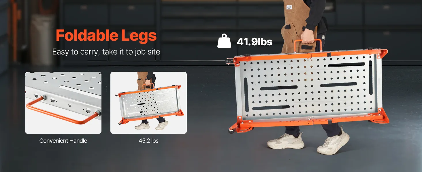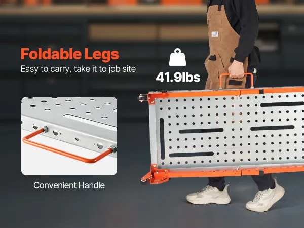Dankzij de opklapbare poten is deze laswerkbank zeer draagbaar en eenvoudig op te bergen. Vouw ze eenvoudig op en neem ze mee naar de bouwplaats. Dit biedt u comfort en flexibiliteit, waar u ook werkt.