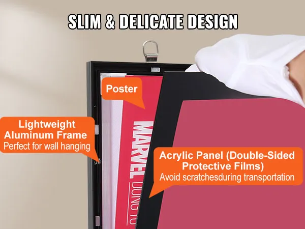 Ultra-slim & elegant: The lightweight aluminum frame is perfect for wall mounting and effortlessly transforms any room into an art exhibition. The acrylic plate with double-sided protective film protects your posters from scratches during transport and ensures that they remain flawless and intact.