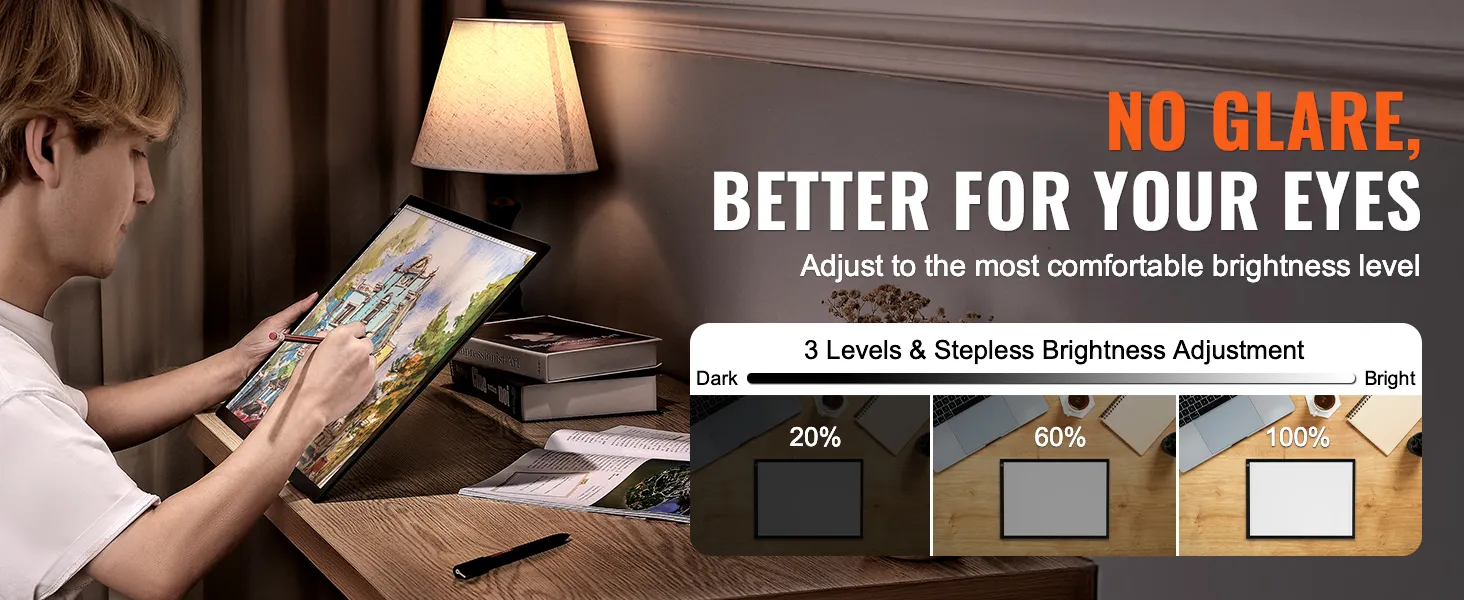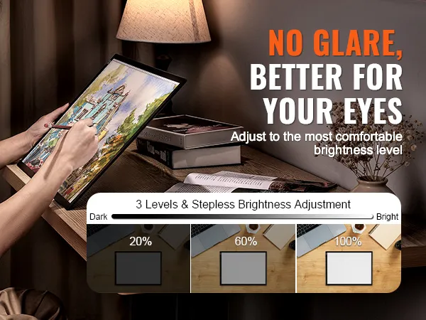 You can adjust the light box brightness to suit your environment. It provides shadow-free, glare-free illumination, with soft, even light that helps reduce eye strain for a more comfortable experience.