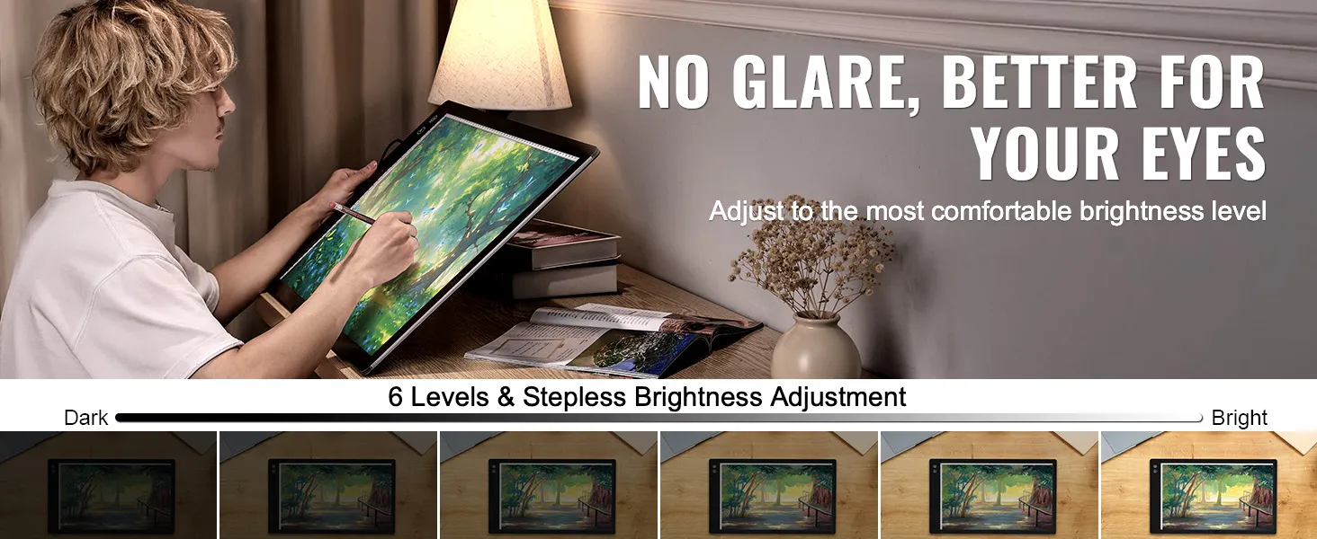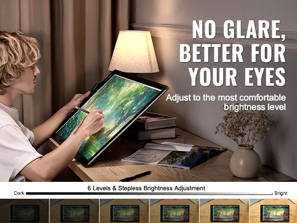 You can adjust the light box brightness to suit your environment. It provides shadow-free, glare-free illumination, with soft, even light that helps reduce eye strain for a more comfortable experience.
