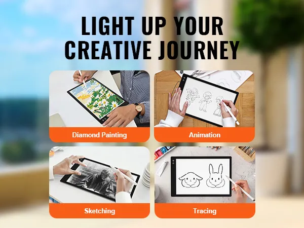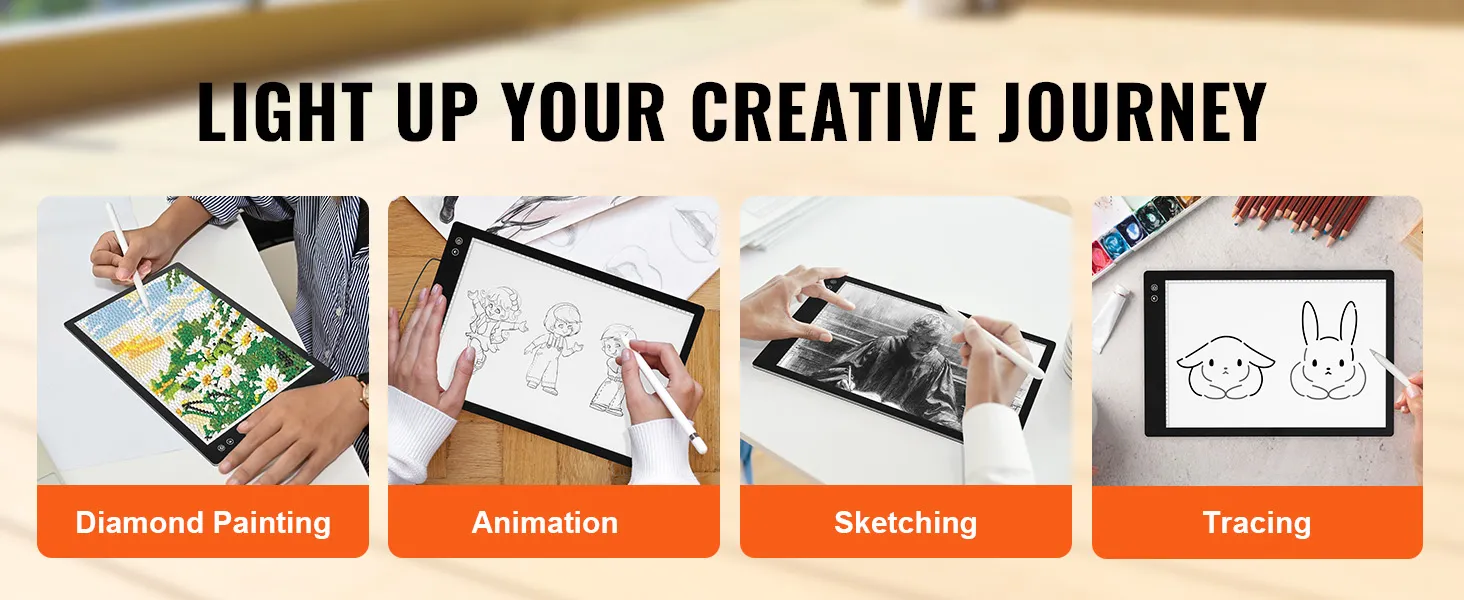 Our tracing light box serves multiple purposes, ideal for stencil printing, 2D animation, calligraphy, embossing, scrapbooking, tattoo transfers, sketching, drawing, sewing projects, and more.