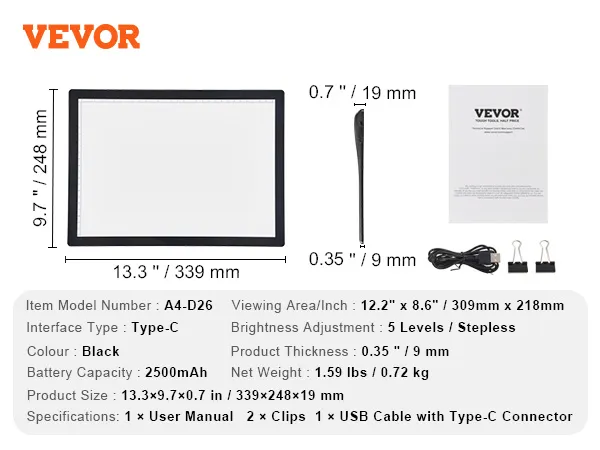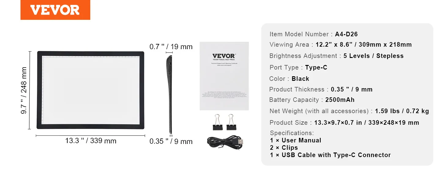 VEVOR A4 LED-lichtpad met 5 dimbare helderheidsniveaus, oplaadbaar lichtbord voor traceren, lichtbak voor diamantschilderen, animatieschetsen en tekenen (zwart)