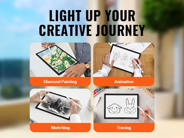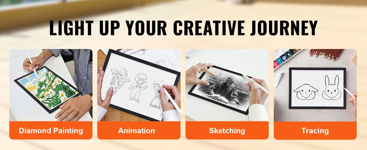 Onze transparante lichtbak is veelzijdig en ideaal voor sjabloondruk, 2D-animatie, kalligrafie, reliëfdruk, scrapbooking, tatoeagetransfers, schetsen, tekenen, naaiprojecten en nog veel meer.