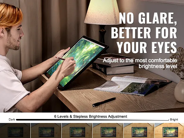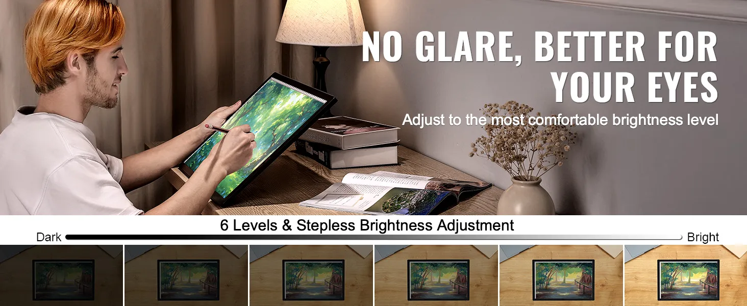 You can adjust the light box brightness to suit your environment. It provides shadow-free, glare-free illumination, with soft, even light that helps reduce eye strain for a more comfortable experience.
