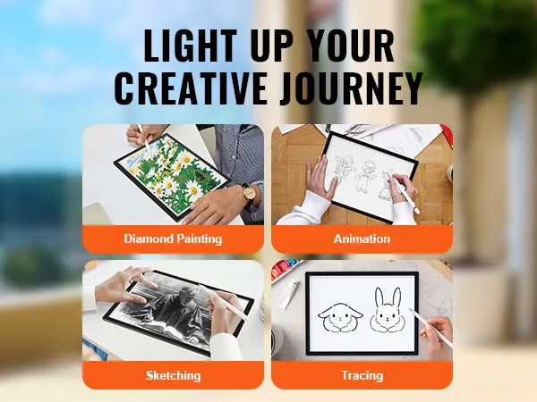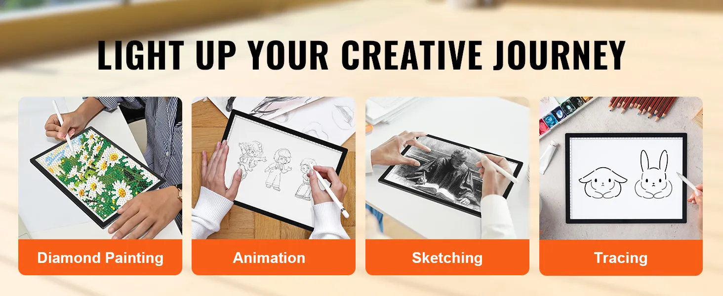 Our tracing light box serves multiple purposes, ideal for stencil printing, 2D animation, calligraphy, embossing, scrapbooking, tattoo transfers, sketching, drawing, sewing projects, and more.