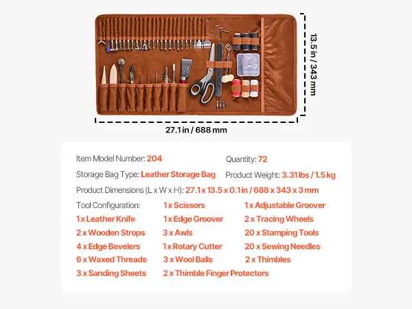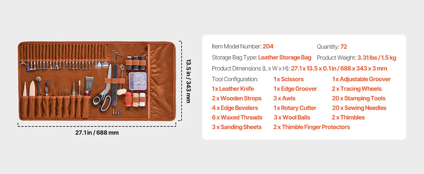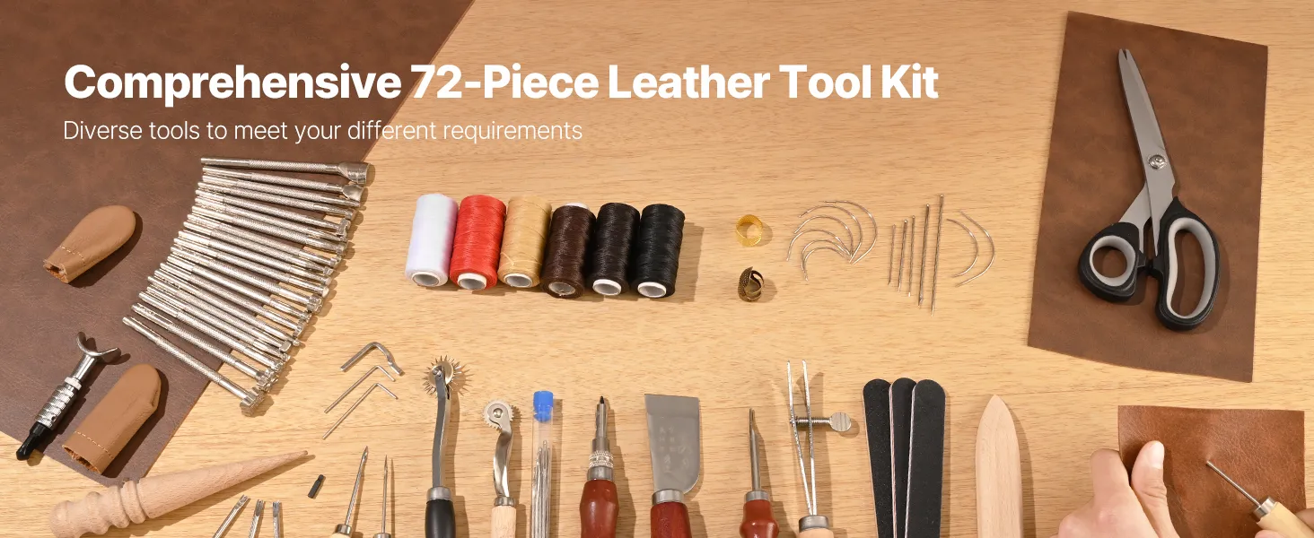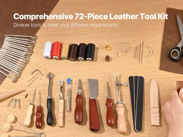 This 72-piece leather craft kit includes everything you need for punching, cutting, stitching, and carving. Made with high-quality materials for durability and ease of use. It also comes with a practical storage bag to keep your tools organized and easy to carry.