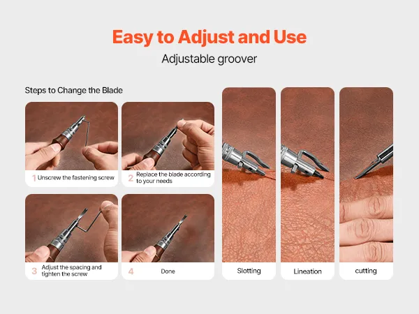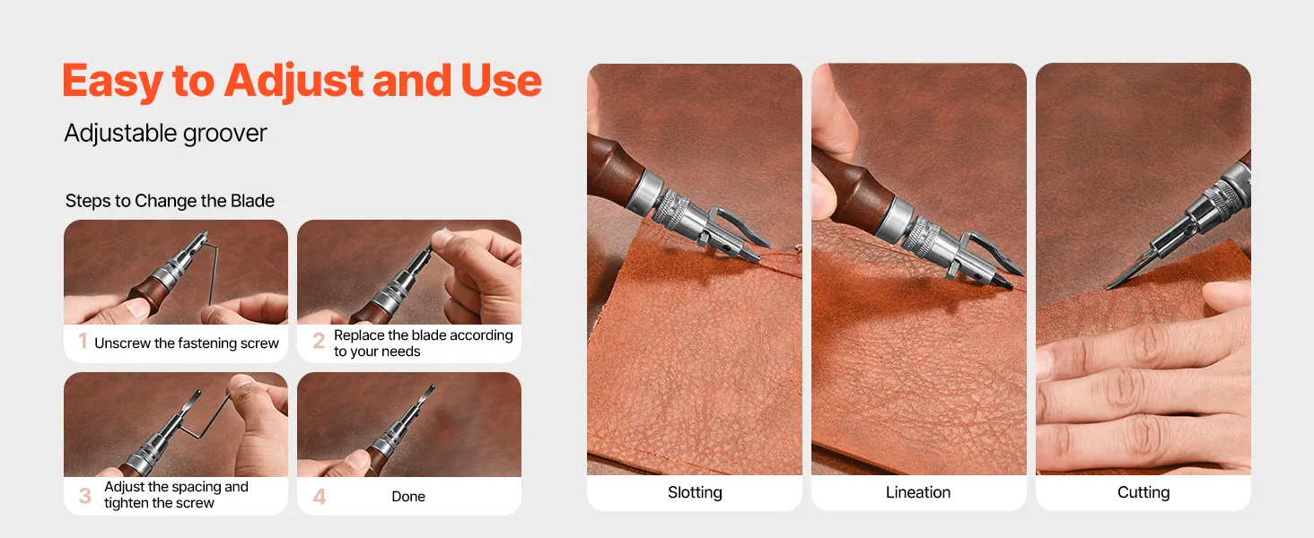 The leather tooling kit features an adjustable groover that lets you easily change the depth and width of the groove to suit different projects, with a simple replacement process for effortless use.