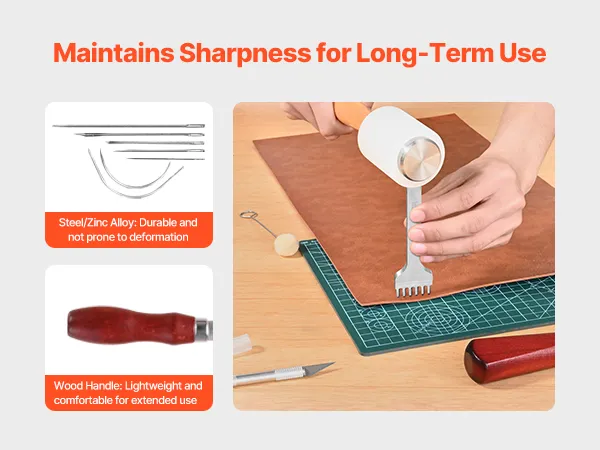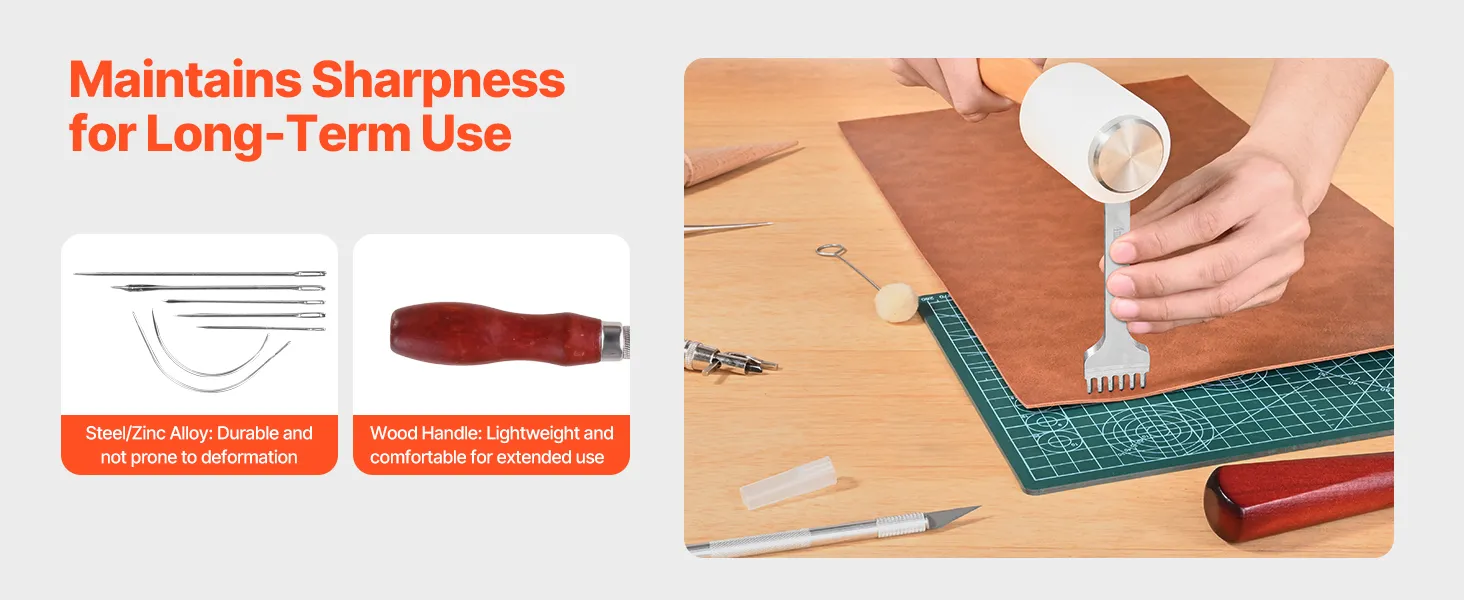The leather sewing kit is made from high-quality metal and wood, ensuring long-lasting reliability and consistent performance over time.