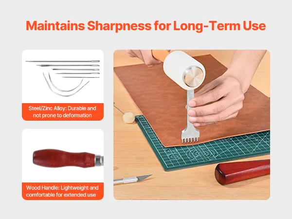 The leather sewing kit is made from high-quality metal and wood, ensuring long-lasting reliability and consistent performance over time.