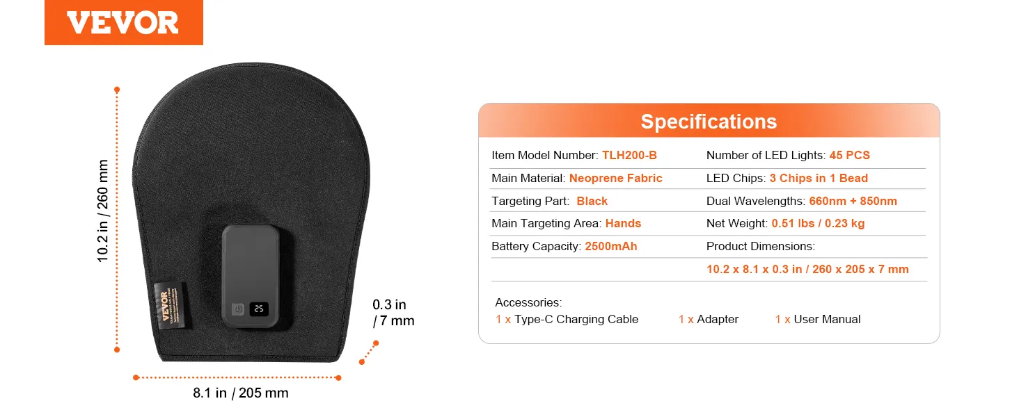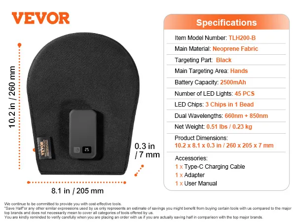 Effective Pain Relief: VEVOR's 10.2 x 8.1-inch red light therapy device for hand features 45 LED lights and 135 chips (each light contains 3 chips). It can wrap the entire hand, fingers, palm and wrist, providing high radiation to relieve pain, speed up healing, and promote blood circulation.