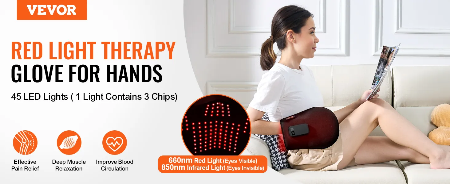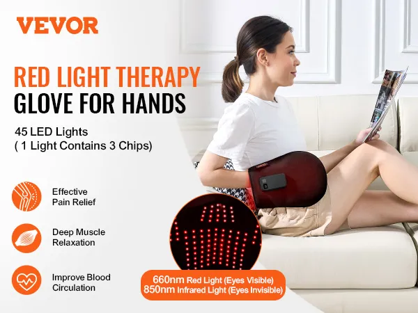 Experience professional-grade therapy to relieve hand numbness and pain. Featuring 660nm and 850nm wavelengths, 45 LEDs and 135 chips, VEVOR red light therapy glove illuminates your entire hand, fingers, palm and wrist, delivering high-intensity light to relax muscles and promote circulation.