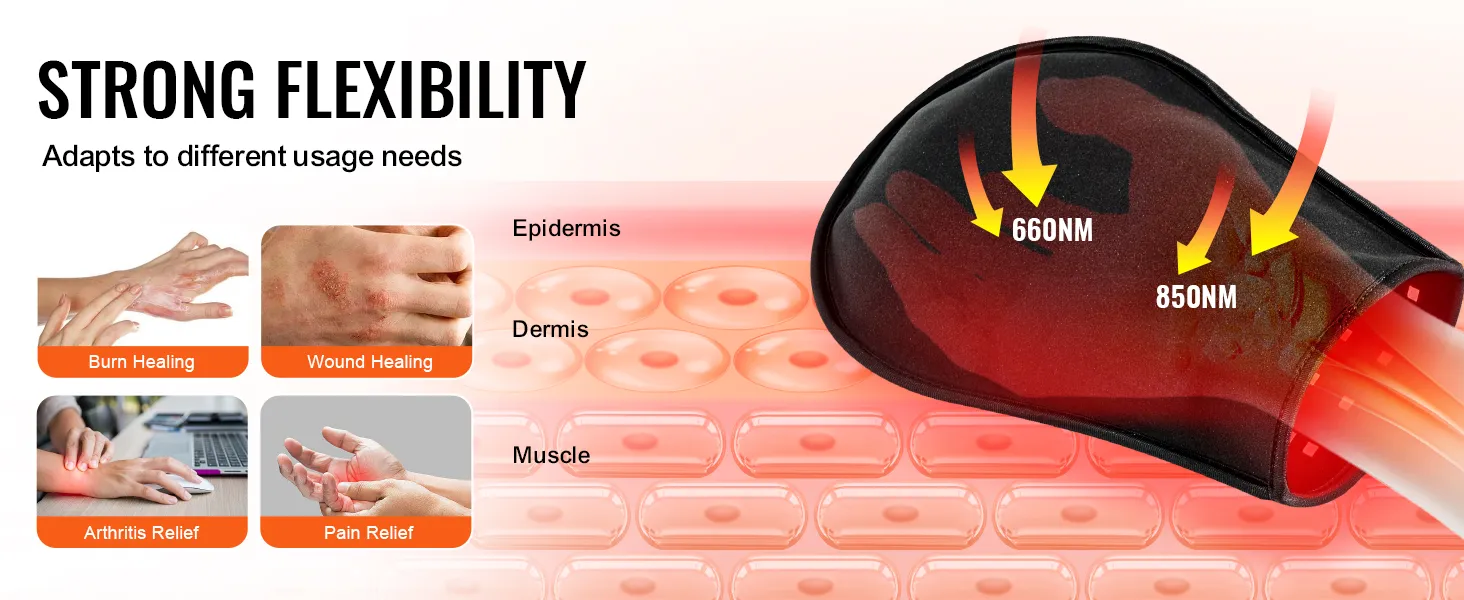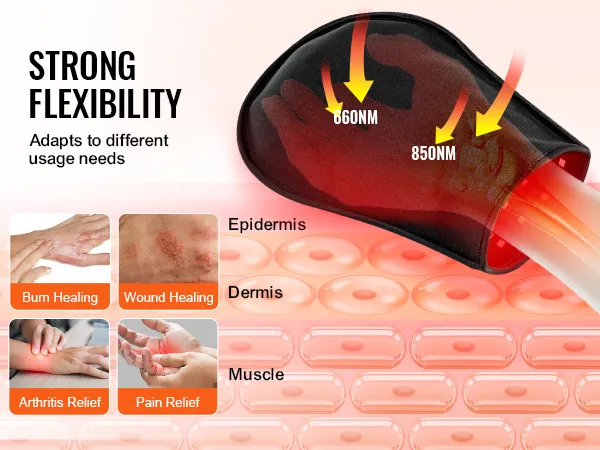 The red light therapy for hand finger utilizes 660nm + 850nm dual wavelengths, penetrating deep into the skin to effectively relieve hand fatigue and soreness. It can aid in the healing of burns, relieve arthritis, promote wound healing, and alleviate pain.