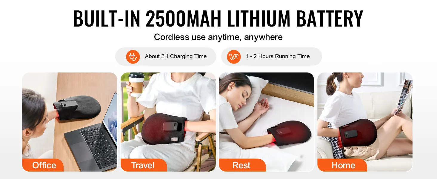 2500mAh magnetic power bank enables wireless use anytime, anywhere, delivering a convenient light therapy experience. With a charging time of approximately 2 hours and a battery life of 1-2 hours, you can enjoy uninterrupted therapy sessions wherever you are.