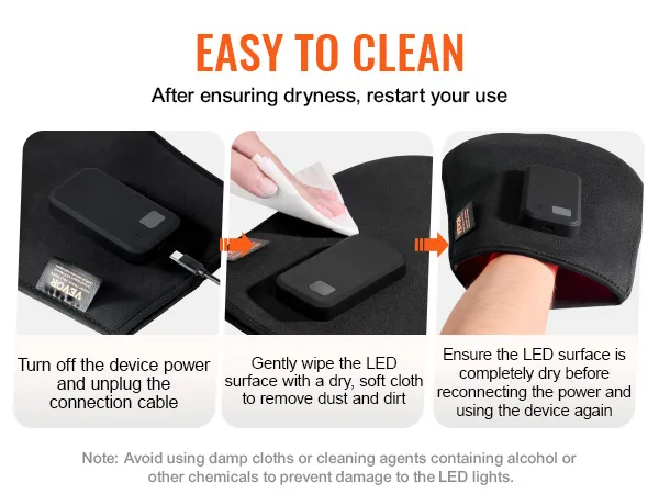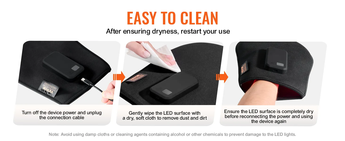 The transparent TPU film makes the therapy glove effortless to clean. Make sure the device is thoroughly dry before using it again. Avoid using damp cloths or cleaning agents that contain alcohol or chemicals as they may damage the LED lights.