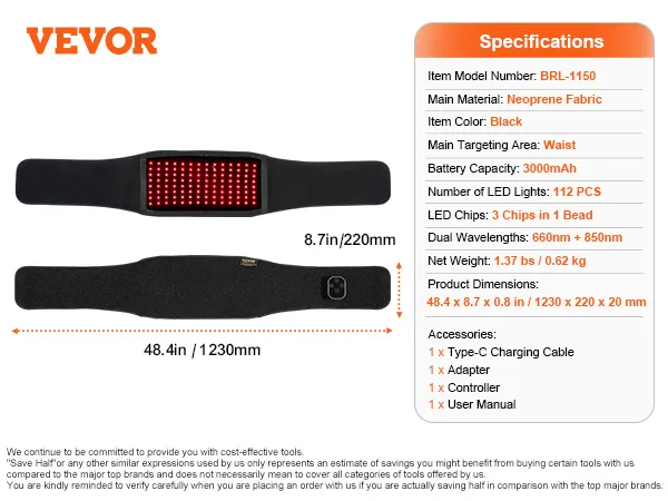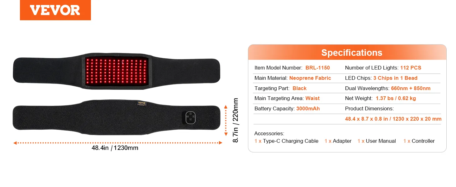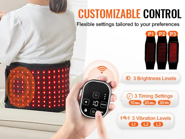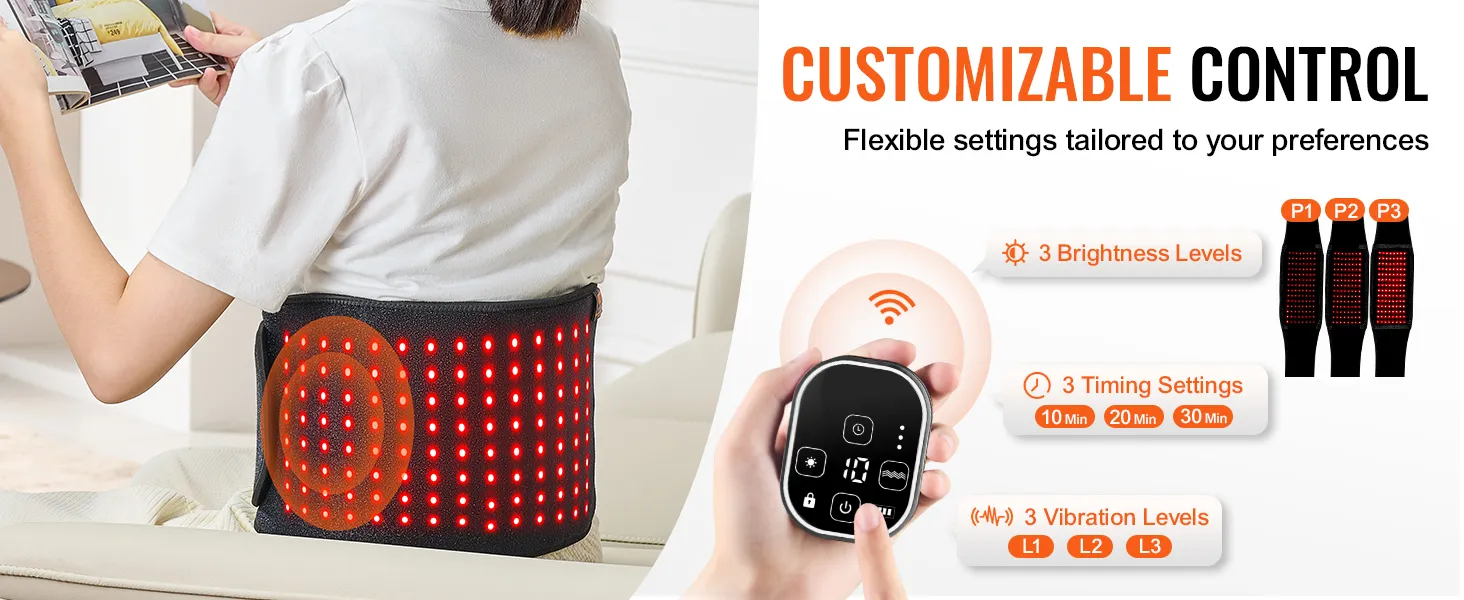 Revitalize Your Body: VEVOR red light therapy belt for waist allows you to enjoy various red light therapy modes. Switch freely among 660nm red light, 850nm light, 3 intensities, 3-level vibration, and 10Hz pulse, meeting your personalized needs and bringing you a comprehensive red therapy experience.