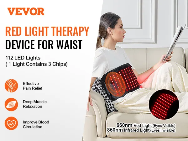 Experience professional-grade therapy that speeds up healing and relieves pain. Featuring 660nm and 850nm wavelengths, 112 LEDs and 336 chips, VEVOR red light therapy belt wraps around waist, back, neck, or shoulders, delivering high-intensity light to relax muscles and promote blood circulation.
