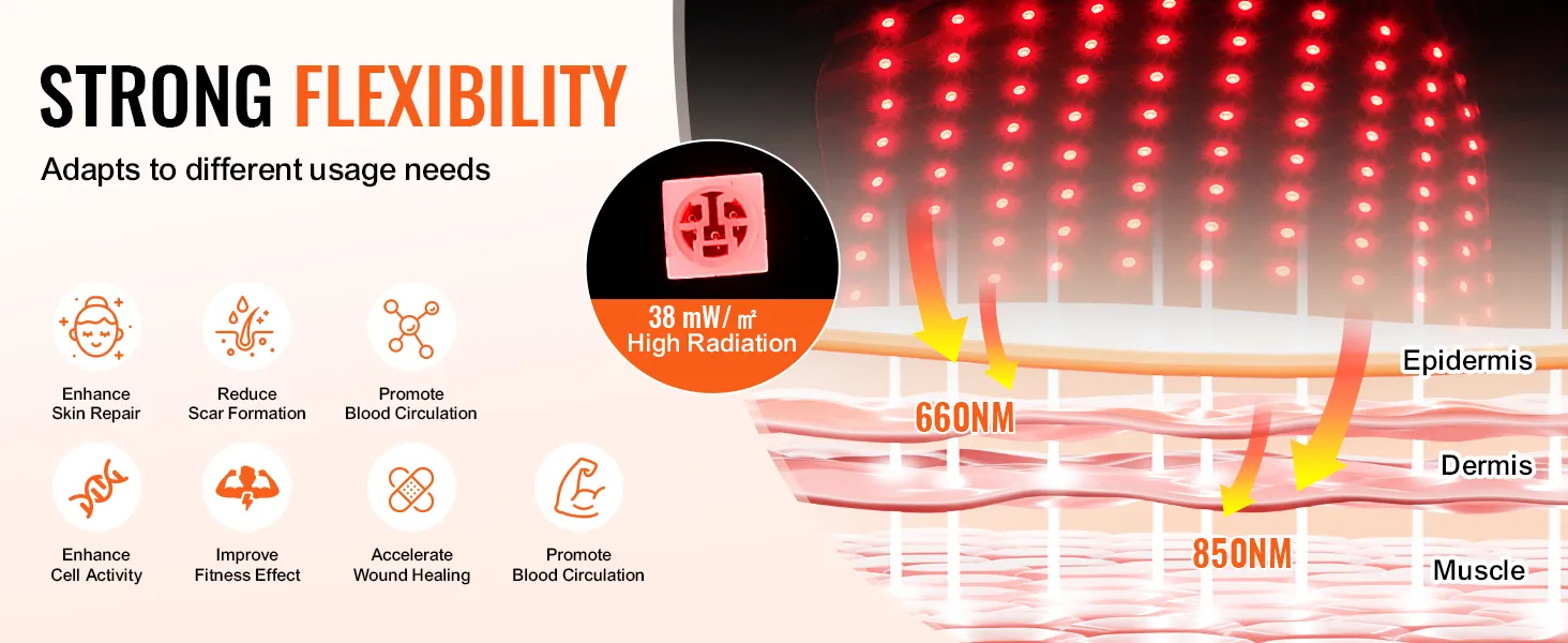 Effective Pain Relief: VEVOR's 48.4 x 8.7-inch red light therapy wrap pad features 112 LEDs and 336 chips (each light contains 3 chips). It can be wrapped around your waist, neck, back, knees and shoulder, providing 38 mW/cm high radiation to relieve pain, relax muscles, speedy healing, and promote blood circulation.