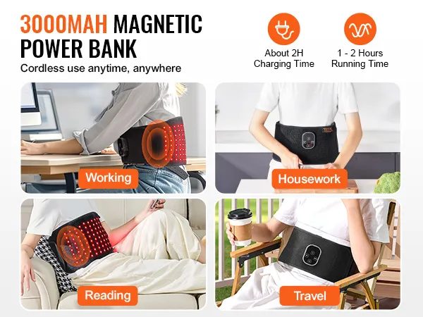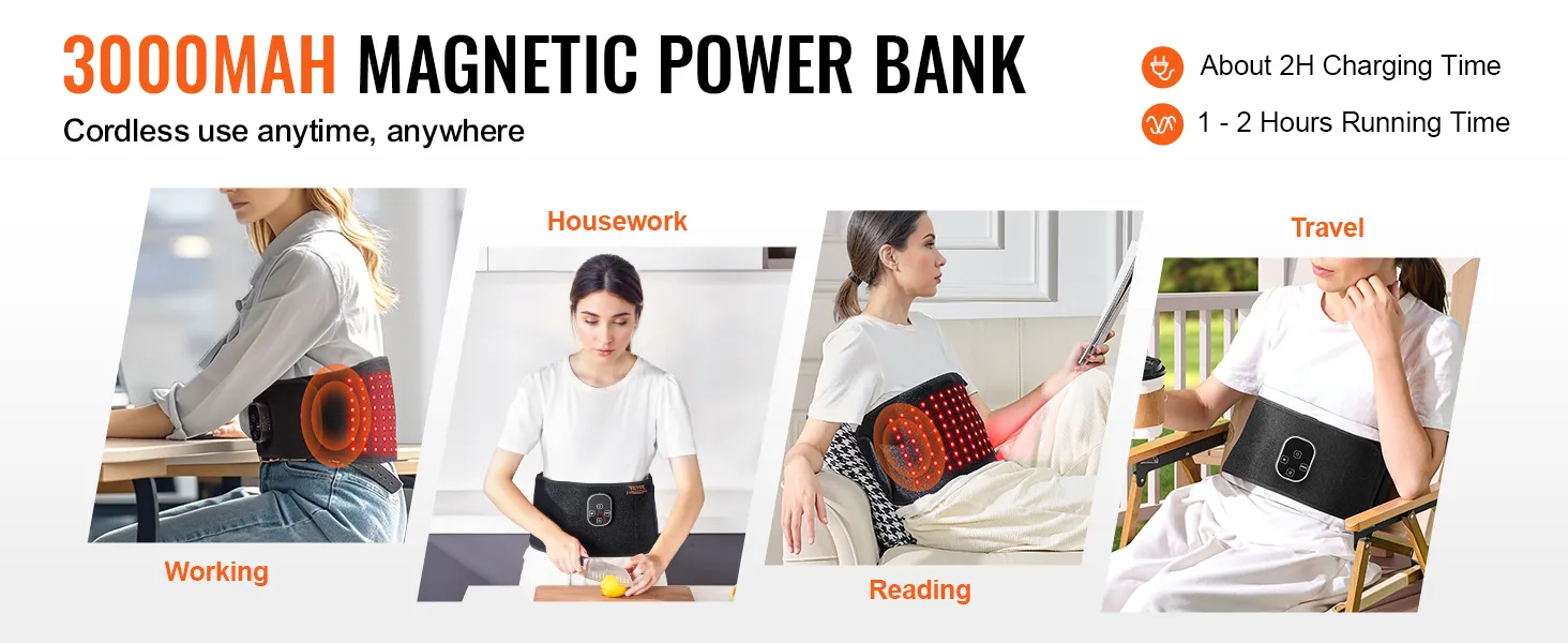 3000mAh magnetic power bank enables wireless use anytime, anywhere, delivering a convenient light therapy experience. With a charging time of approximately 2 hours and a battery life of 1-2 hours, you can enjoy uninterrupted therapy sessions wherever you are.
