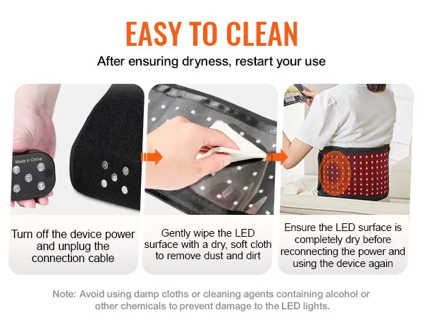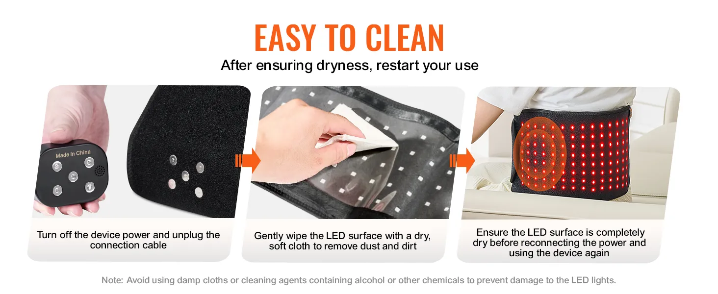 The transparent TPU film makes the belt effortless to clean. Make sure the device is thoroughly dry before using it again. Avoid using damp cloths or cleaning agents that contain alcohol or chemicals as they may damage the LED lights.