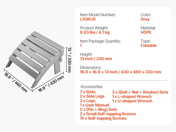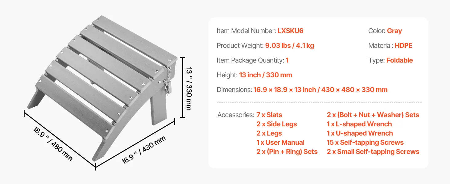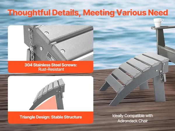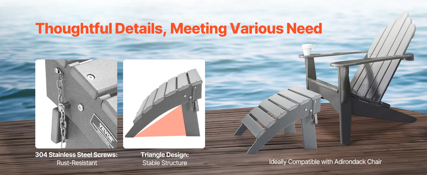 The Adirondack Ottoman is made of durable HDPE material with corrosion-resistant 304 stainless steel screws. It’s foldable for easy storage, installs in 4 steps, and features a comfortable 13-inch height with a 41-degree angle. Ideal for various outdoor settings.