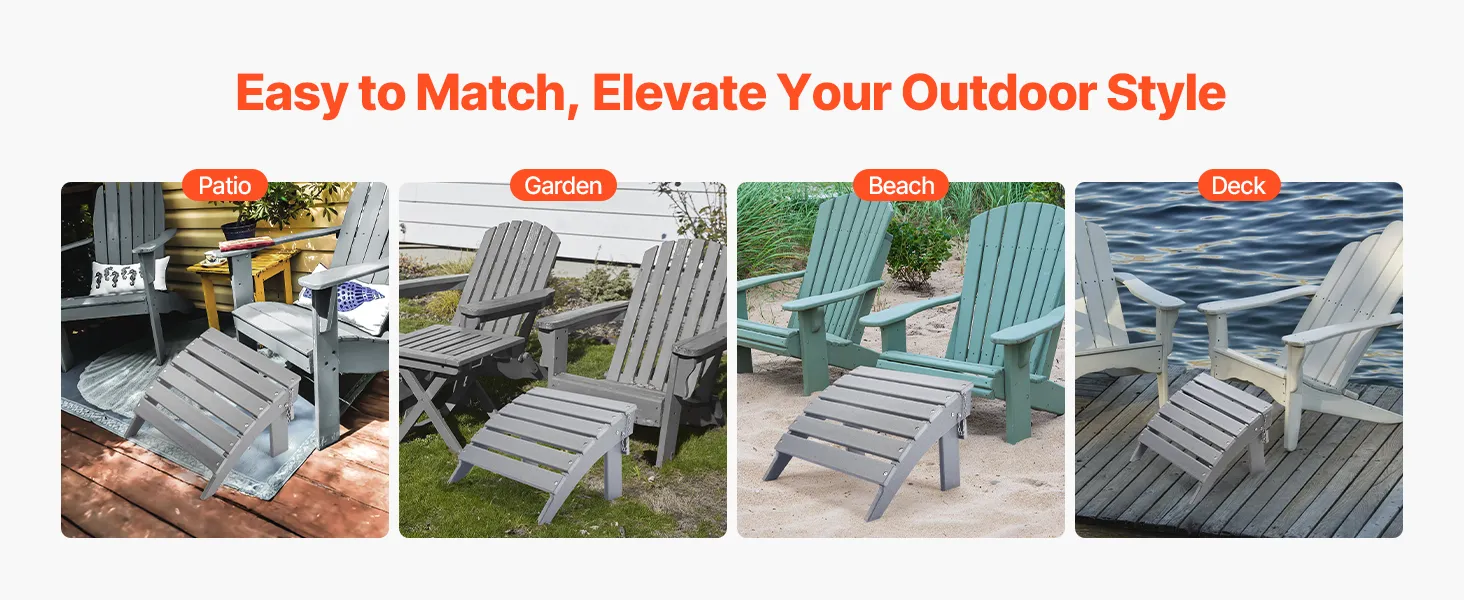 Classic Adirondack Style: This folding Adirondack Ottoman features a timeless design, made specifically for Adirondack chairs. It’s ideal for various outdoor spaces, such as patios, porches, backyards, gardens, lawns, and decks—wherever you desire.