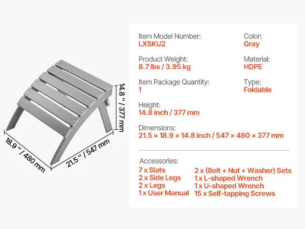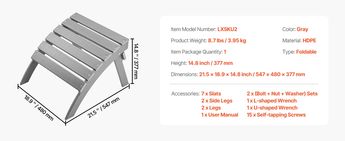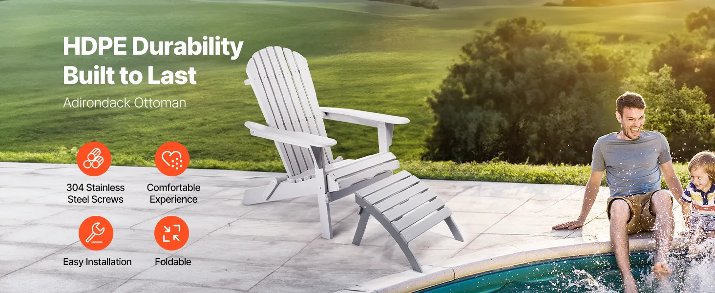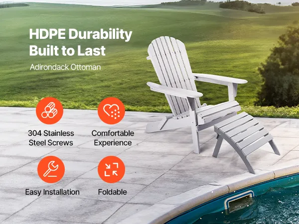 The Adirondack Ottoman is made of durable HDPE material with corrosion-resistant 304 stainless steel screws. It’s foldable for easy storage, installs in 4 steps, and features a comfortable 14.8-inch height with a 45-degree angle. Ideal for various outdoor settings.
