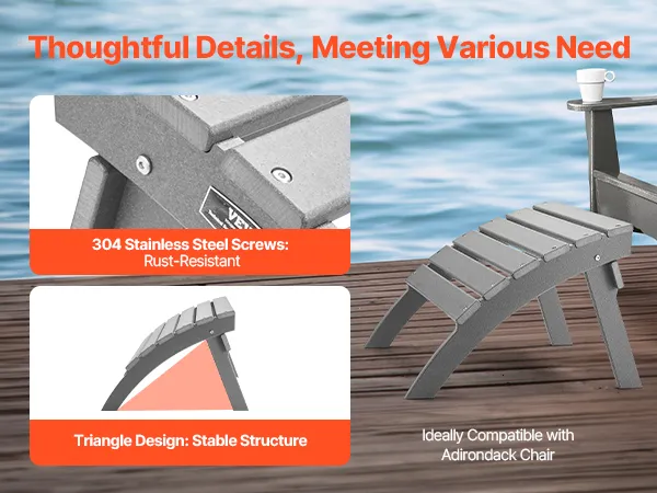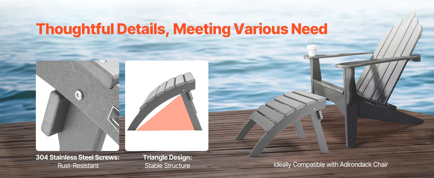The folding Adirondack Ottoman ideally matches the Adirondack chair, using 304 stainless steel screws to guard against rust. The triangular design enhances stability, providing a more secure and comfortable experience.