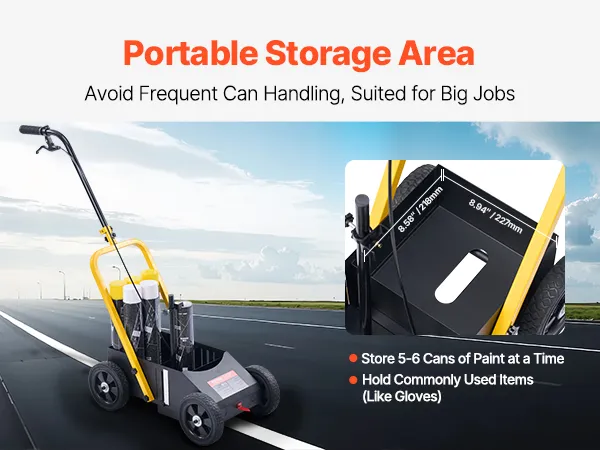 Equipped with a portable storage area, this striping line machine can hold 5-6 cans of paint at once, along with other essential tools and accessories, ensuring everything you need is within reach while working.