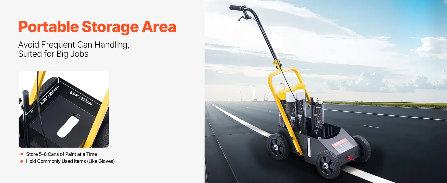 Portable Storage Area: Our striping machine is equipped with an additional storage area for quick paint can swaps or color changes. It can also store other commonly used tools and accessories, allowing you to easily access everything you need during work.
