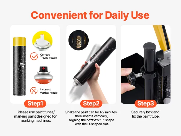 2-4 Inch Adjustable Line Width: Adjust the line width of the striping line machine by changing the height of the paint can from the ground, allowing flexibility in line thickness. Note: Please use a T-type paint can designed for the line marking machine; avoid using paint cans with straight-up or straight-down nozzles. Correctly place the T-type paint nozzle parallel to the U-shaped slot for more accurate 2-4 inch stripes. When there is less paint in the can, adjust the height to accommodate the stripe width.