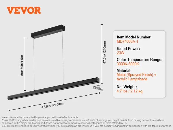 VEVOR Dimmable Linear Pendant Light, 20W, 47 in LED Linear Light Fixture Chandelier with Remote Control Acrylic Lampshade, Adjustable 3000K-6000K Color Temperature Brightness, for Dining Room Kitchen