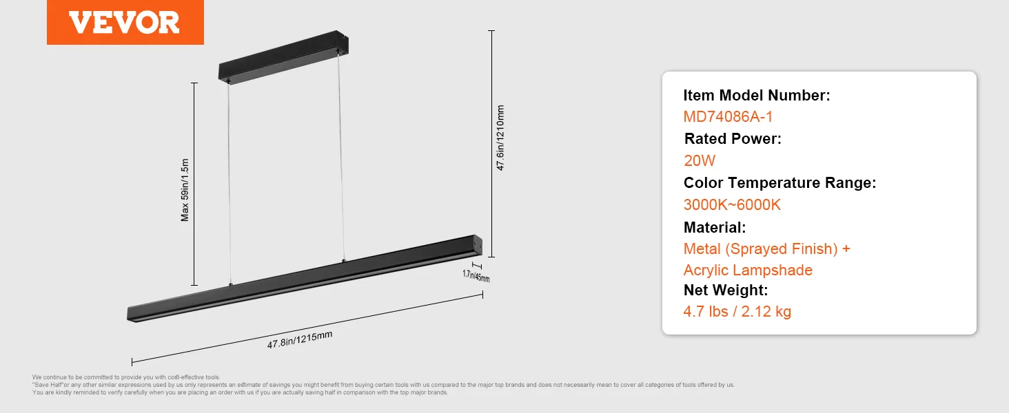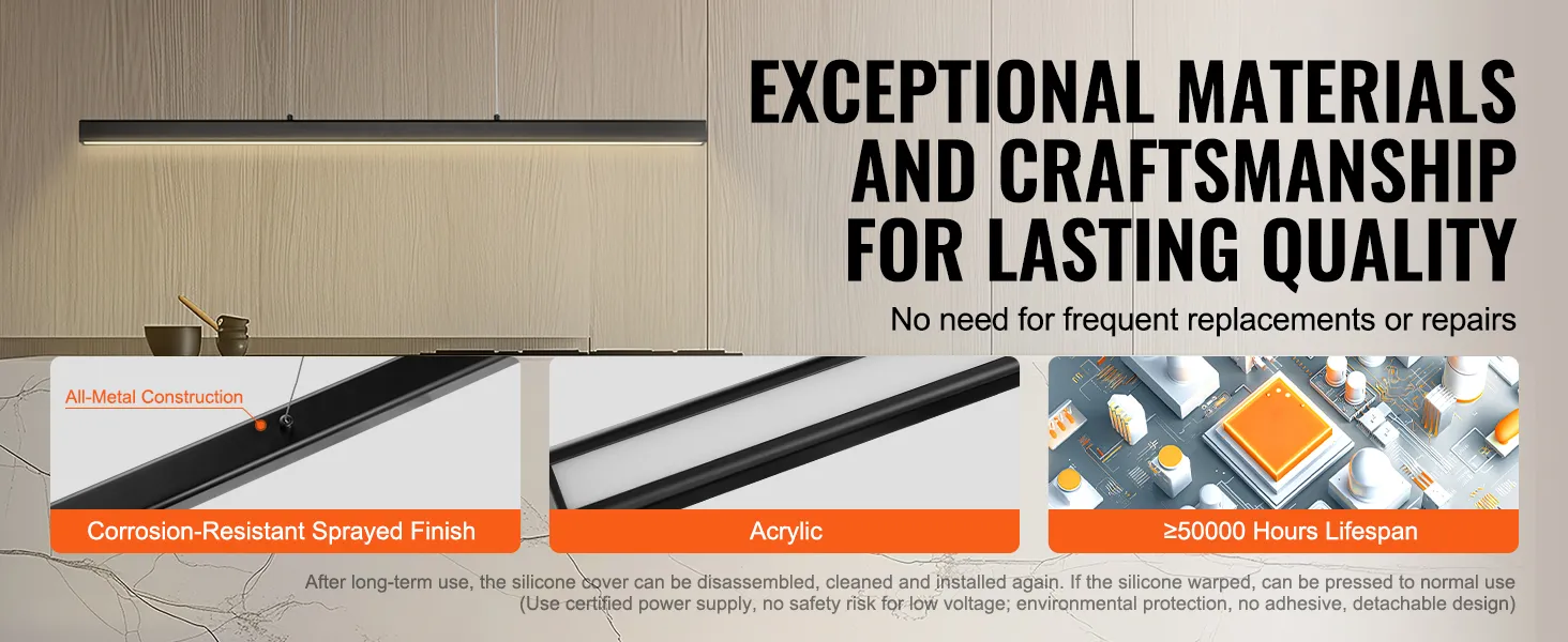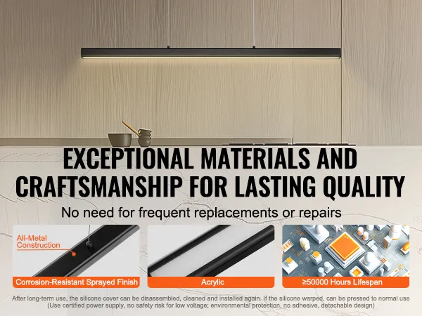 Equipped with high-brightness LED bulbs, our linear pendant light boasts low energy consumption and powerful, stable performance. Experience strong, consistent illumination that lasts longer, ensuring you get the most out of your lighting investment.