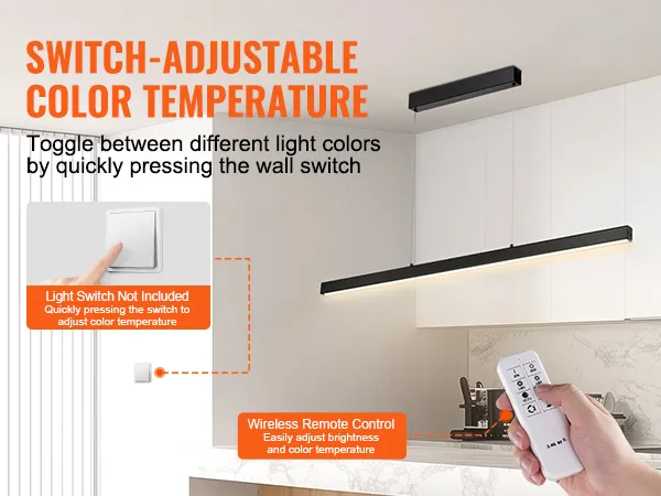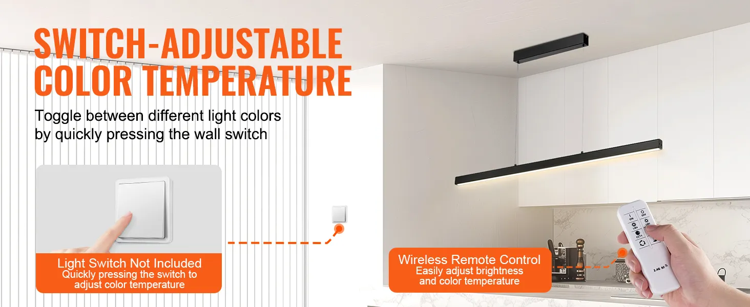 Adjustable & Customizable Lighting: Equipped with a infrared remote control, our linear pendant light allows you to adjust the color temperature from 3000K (warm light) to 6000K (daylight white) and brightness levels from 10% to 100%. Additionally, you can quickly toggle the lighting by continuously pressing the wall switch to select your preferred color temperature for any space. (Wall switch not included.)
