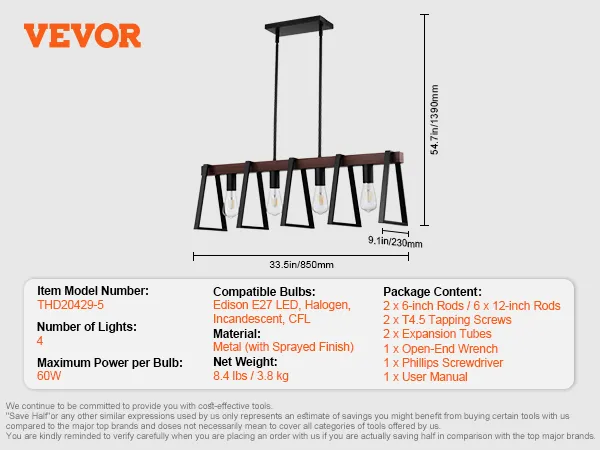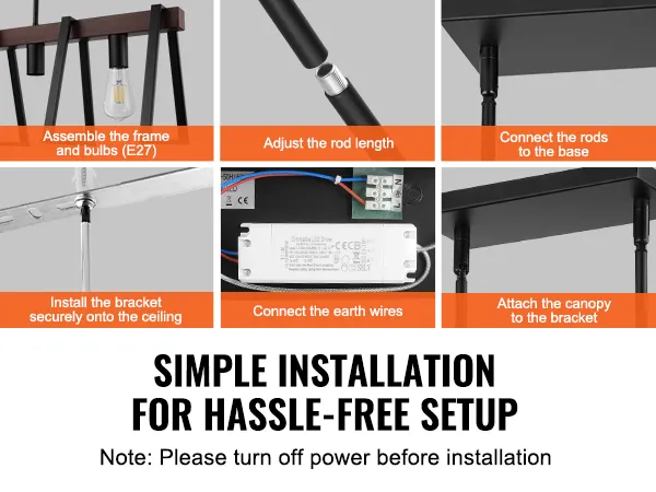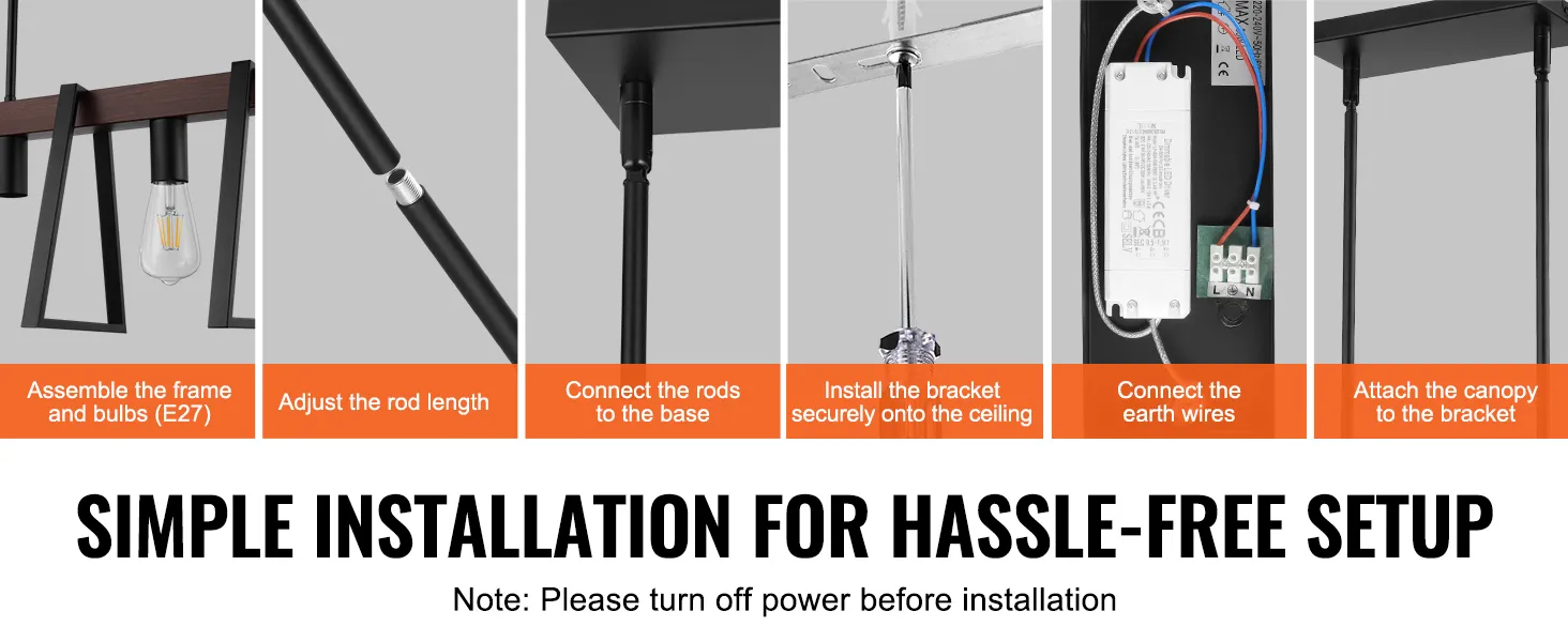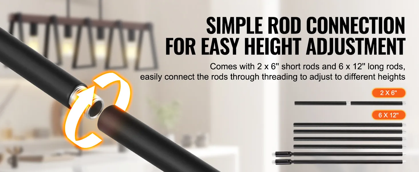 Onze eetkamerlamp wordt geleverd met 8 palen (2 x 6 inch en 6 x 12 inch), zodat je de hoogte van de lamp eenvoudig kunt aanpassen aan elk plafond. Elke lampkop ondersteunt maximaal 60W en alle E27-lamptypes.