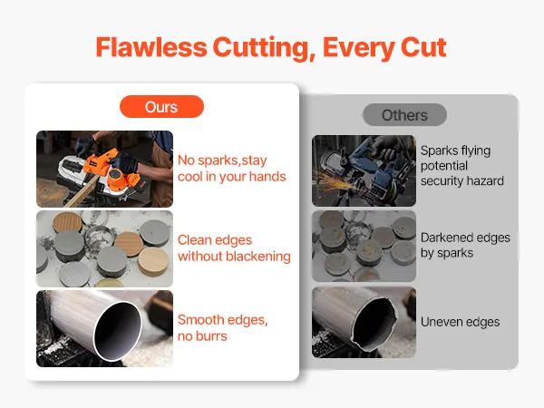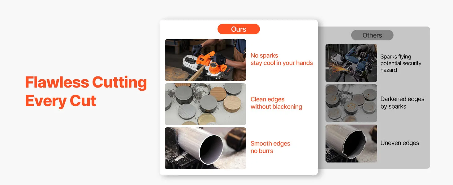 Geen ruwe randen: dankzij de robuuste borstelloze motor levert deze lintzaag snel en soepel zagen met gemak. Vonkvrij zagen verhoogt de veiligheid, terwijl het schone, braamvrije oppervlak u helpt om nauwkeurig te zagen.