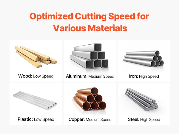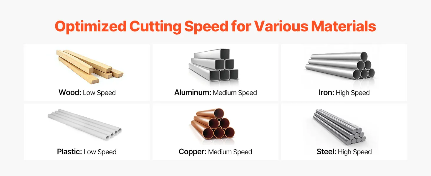 Voor optimale resultaten past u de snijsnelheid aan van 0 tot 192 m/min, afhankelijk van het materiaal of de taak. Of het nu gaat om metaal, hout of kunststof, het nauwkeurig afstellen van de snelheid zorgt keer op keer voor schonere sneden, meer precisie en een soepele workflow.